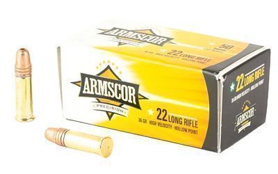 Armscor, .22 Long Rifle Ammunition, 36 Grains, High Velocity, Copper Plated Hollow Point, 50 Rounds per Box, 5000 Rounds per Case