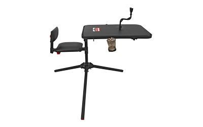 The Xtreme Shooting Bench from Birchwood Casey offers superior comfort with a 2" thick padded back rest and seat and the option for the seat and top to swivel together or independently at 360 degrees for undeniable versatility. The 23"W X 34"L padded top offers a comfortable and stable shooting surface for target practice or field hunting and includes three interchangeable accessories; a cup holder, EZ access gear basket, and gear hook. The adjustable seat is 12"W X 41"D X 2" thick with a weight limit of 300lbs., while the bench itself weighs 46lbs.