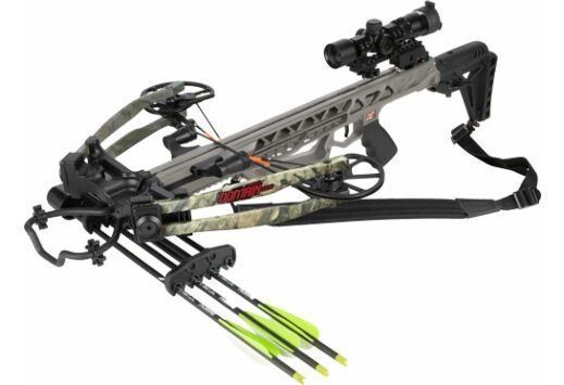 This ready-to-hunt crossbow package includes an Illuminated Reticle Scope, 3 Bear X TrueX Max arrows, a 4-arrow quiver, sling, manual cocking sled, and arrow lube/string wax
