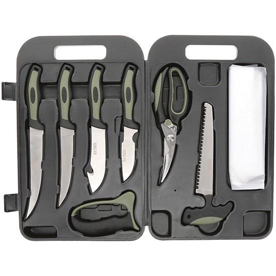 Old Timer Camp Kit has all the tools a hunter need in order to fully break down and process game. Each knife is designed with a comfort grip rubber handle and an included sharpener for repeated use. The durable roto-molded case with built in cutting board is easy to clean while protecting the gear inside no matter where the hunt takes you.