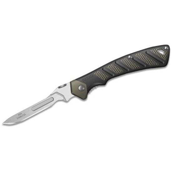 Replaceable blade knives are swiftly becoming the tool of choice for hunters due to the variety of blades they can utilize as well as the lack of maintenance required when you could just switch out the blade. This replaceable knife comes with 12 replacement scalpel blades. The blade has a one-handed opening option in the form of a thumbstud and locks open firmly with a liner lock. The handles have a TPE rubber overmold that provides a sturdy grip even when wet. The knife comes with a polyester sheath that accommodates both the knife and the extra blades.