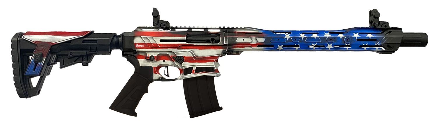 Citadel's Boss-25 is a semi-auto AR style shotgun that features a synthetic stock with an adjustable comb, adjustable sights, and upper picatinny rail. This model has an American Flag cerakote finish.