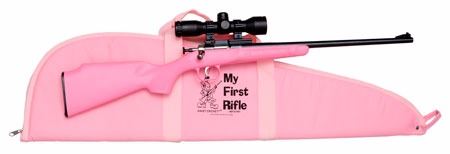 Crickett's Single Shot 22 LR rifle features a pink synthetic stock, iron