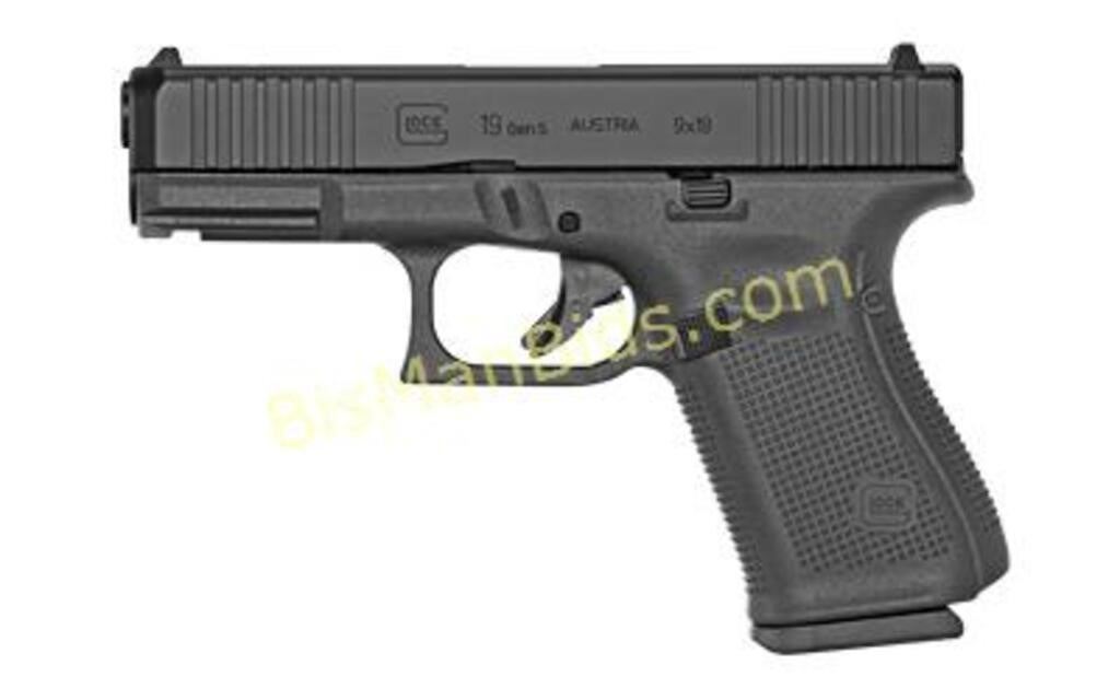 Glock, 19 Gen5, Striker Fired, Compact, 9MM, 4.02" Marksman Barrel, Polymer Frame, Matte Finish, Fixed Sights, 15Rd, 3 Magazines, Ambidextrous Slide Stop Lever, Flared Mag Well, nDLC Finished Slide and Barrel, No Finger Grooves, Front Serrations