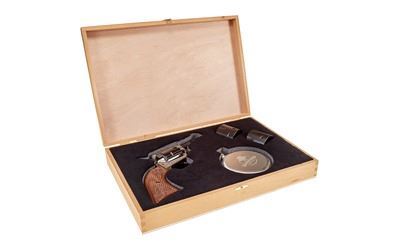 A pint-sized revolver with an Old West flair! Meet the new Heritage Barkeep. The single-action Barkeep comes chambered and ships with the affordable .22 LR rimfire cylinder. Built for optimal concealability in a light and portable package, the Barkeep boasts fixed open sights for fast action and a clean sight picture. Several grip options deliver classic western styling to compliment the standard black oxide or casehardened frame finish. With a two-inch barrel configuration, this compact carry revolver checks all the boxes for form and function. This Barkeep Kit comes with Cedar Display Box, flask and shot glass.