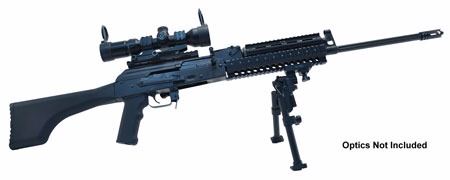 7.62x39 cartridge. It is equipped with a standard quad rail, bolt hold