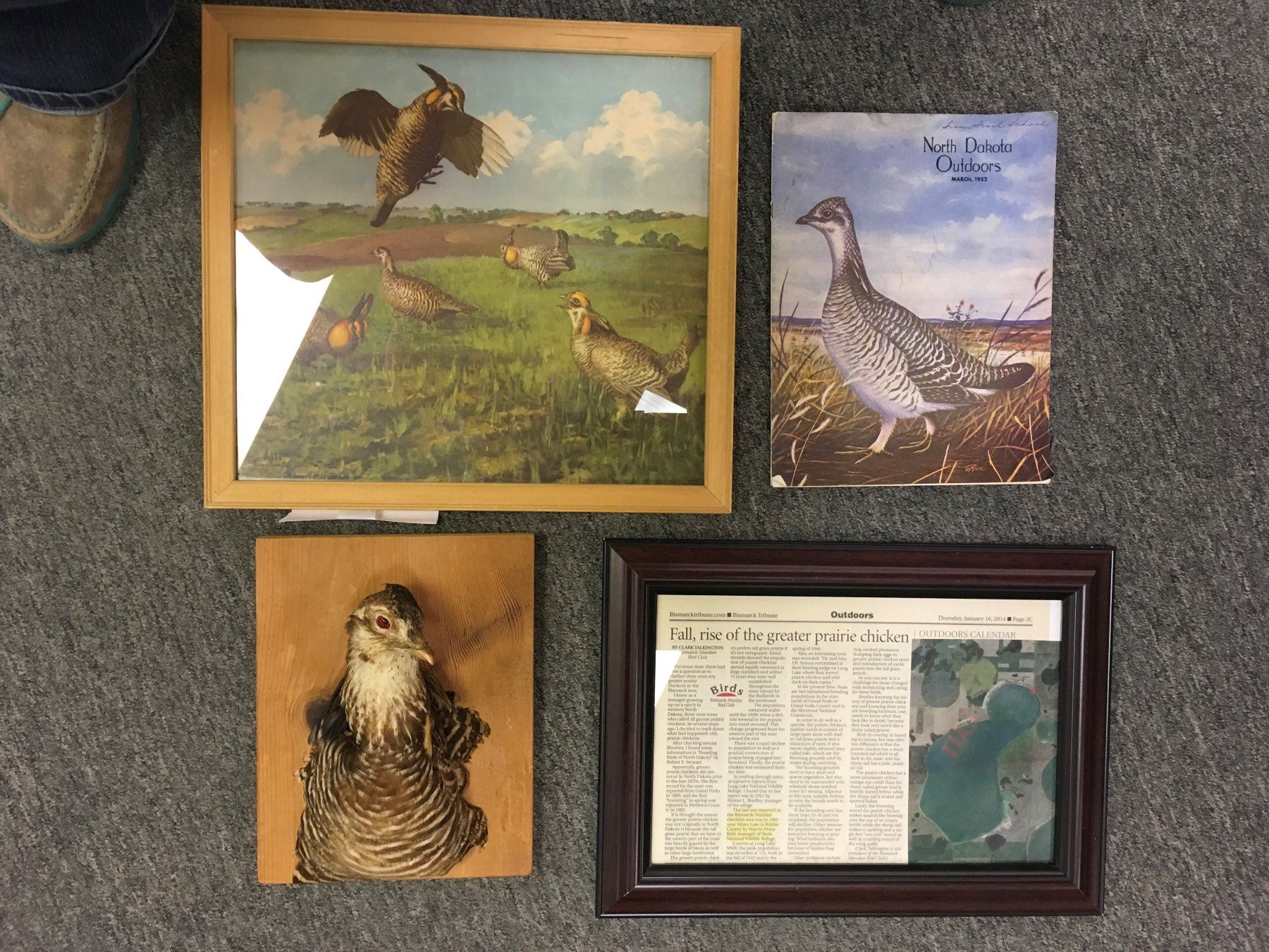 Seller harvested the last native prairie chicken in 1965 north of Sibley Lake in North Dakota. Mounted prairie chicken is that last bird. Included is the framed 2014 Tribune Article about the last of the prairie chickens. Also included, is a prairie chicken print by Richard E Bishop and a North Dakota Outdoors magazine from 1952. Bawk, Bawk.