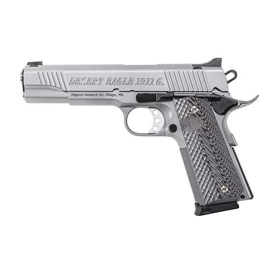 The DE1911GSS features a 5.05" barrel, 8.625" OA Length, slide width of 1.28", and a weight of 36.2 oz. The slide thickness is 0.92", grip thickness of 1.30", with a trigger pull of 3-4 lbs., and a trigger reach of 2.77". The grip has front strap checkering at 20 lines per inch, G10 Grips (Black/Grey) with stainless steel hex screws. It has a high-profile sculptured rear sight, drift adjustable for windage, pinned-in white dot front sight. It is shipped with two 8 round magazines. This model has the Series 70 configuration.