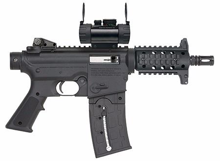 blind. This pistol has a pistol grip stock, vented quad rail forend, and a