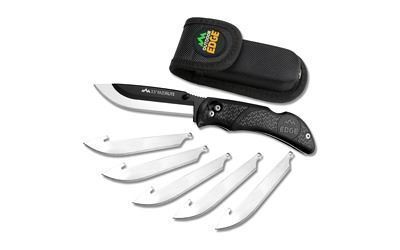 Outdoor Edge's innovative replacement razor blade system is the solution for dull knives. You can sharpen the blade or simply push the lock button to remove and insert a shaving-sharp new one. Rubberized handles ensure a secure, non-slip grip and are available in black and blaze-orange. Each knife comes complete with 6 replacement blades and nylon sheath.