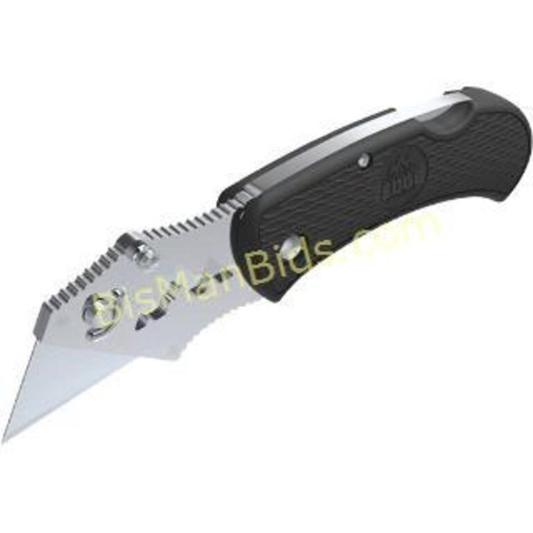 This folding utility knife is a massive upgrade to the classic box cutter—and much, much more. The perfect ergonomics along with extensive jimping on the stainless steel blade holder delivers power from your hand directly to the cutting edge. Simply and safely replace blades with a flick of your finger using the safety guarded thumb button. Accepts all standard utility razor blades. Constructed of 420J2 stainless steel with a sure-grip textured glass/nylon polymer handle with pocket clip.