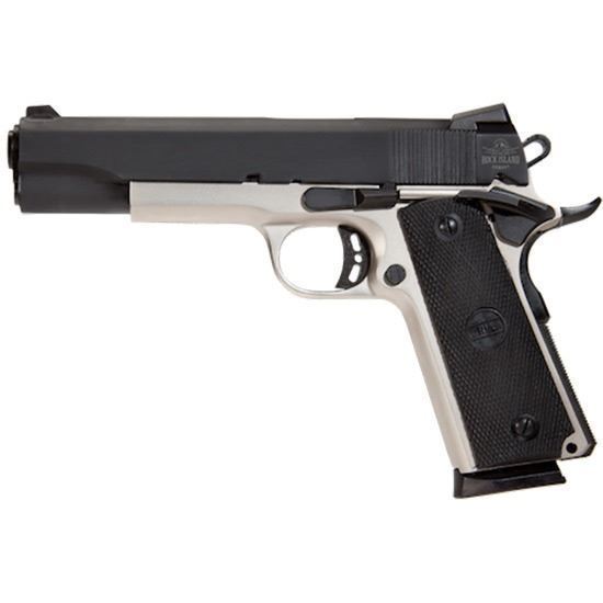 The Rock Island 51447 M1911-A1 FS Tactical Pistol in .45 ACP features a 5-inch barrel, parkerized finish slide, matte nickel frame, wood grips, front dovetail ramp sight, rear snag free sight, series 70 type firing system, skeletonized trigger, combat hammer, single action trigger, an overall length of 8.5 inches, an unloaded weight of 39.5 oz, and an 8+1 round capacity. The .45acp extended beavertail Two-Tone 1911 Tactical will truly be love at first shot. A full length guide rod and snag free combat-style, low profile sights are built in for performance. Comes in a two part finish comprised of a nickel frame and a parkerized slide. The Tactical Model gives you everything you want in a pistol at great value!