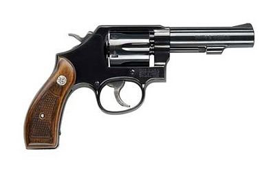 Smith & Wesson, Model 10, Double Action, Medium Frame, 38 Special, 4" Barrel, Carbon Frame, Blue Finish, Wood Grips, Fixed Sights, 6Rd