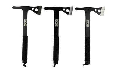 Take target throwing to the next level with the Throwing Hawk set, three pack of one-piece steel hawks with paracord wrapped handles designed for specifically target throwing. Challenge your friends for supremacy of the back yard. These stylized Throwing Hawks are not only fun to sail through the air, they are practical as well. Protected by SOG's hard cased black coating, they are extremely scratch resistant. Their balance, aerodynamics, and proportions make them great throwing hawks. For the same reasons, they also make great back-up field tools. Handles are wrapped with paracord or use without it and you have three tomahawks for the price of one! Includes nylon sheath that safely carries all three.