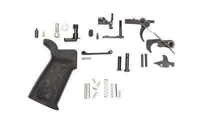 Spike's Tactical, Lower Receiver Parts Kit Standard, 223 Rem/556NATO, Rounded Hammerand Hammer Spring, Trigger and Trigger Spring, Disconnector and Disconnector Spring, Safety Selector, Detent, Spring, Bolt Catch, Roll Pin, Plunger, Magazine Catch, Trigger Guard, A2 Pistol Grip. Black Finish
