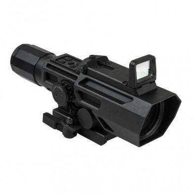 Advance Dual Optic (ADO) 3X-9X variable magnification scope with a 42mm objective lens. The ADO Scope features an integrated Red Dot Reflex Optic on top of the scope body.