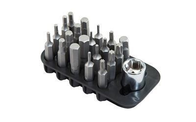 Set includes: 1/2" x 1/4" socket driver, 2.5mm, 3mm, 3.5mm, 4mm, 4.5mm, 5mm, 5.5mm, 6mm, 7mm and 8mm Hex Bits. T6, T7, T9, T10, T15, T20, T27 and T30 Torx Bits.