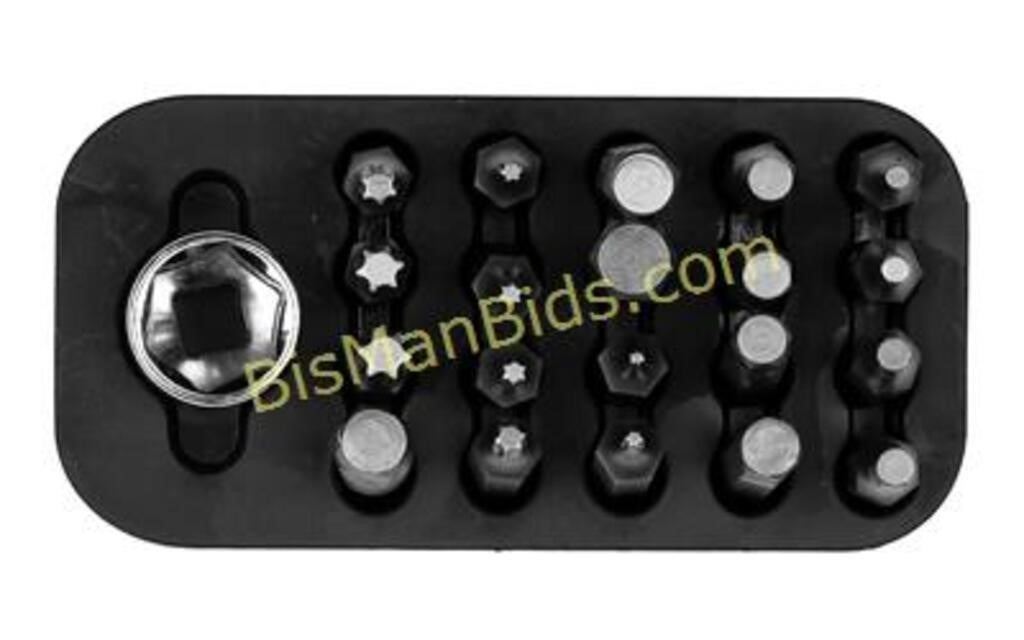 Set includes: 1/2" x 1/4" socket driver, 2.5mm, 3mm, 3.5mm, 4mm, 4.5mm, 5mm, 5.5mm, 6mm, 7mm and 8mm Hex Bits. T6, T7, T9, T10, T15, T20, T27 and T30 Torx Bits.