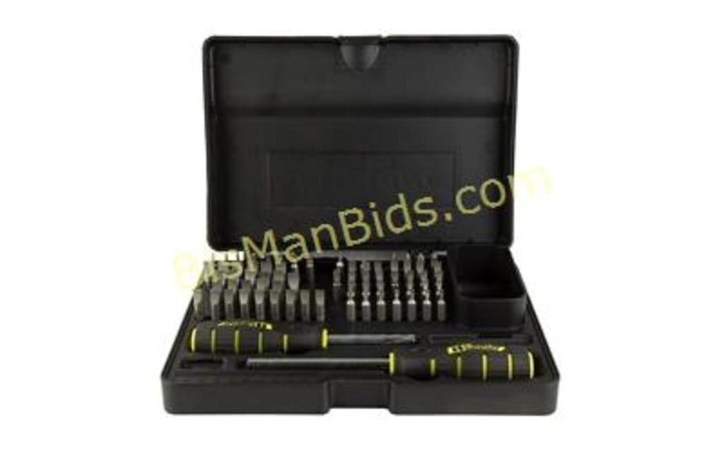The Wheeler 72 Piece screwdriver set features 54 hollow-ground flat bits, 4 Philips, 3 torx, and 8 specialty bits all made from durable S2 tool steel with a 56-58 Rockwell "C" hardness rating. The precision-engineered bits have a concave shape that allows for insertion all the way into the screw slot of maximum contact to prevent burred, buggered, busted up screw slots. The kit also includes 2 non-slip, overmolded plastic handles that come in a convenient hinged storage case which includes a bit location guide.
