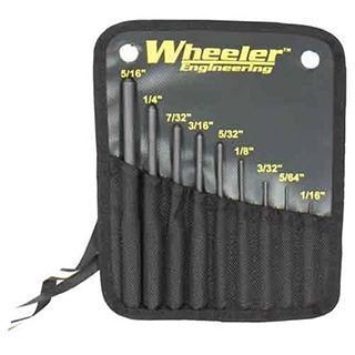The Wheeler Engineering Roll Pin Punches are machined from hardened steel to prevent bending or breaking while driving any size roll pin. The punches are designed with a hemispherical tip to provide proper alignment of the roll pin to prevent damage to the firearm and the roll pin. The 9 piece set includes: 5/16", 1/4", 7/32", 3/16", 5/32", 1/8", 3/32", 5/64", 1/16" punches in a nylon pouch.