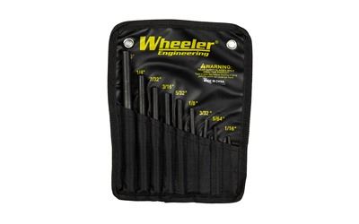 The Wheeler Engineering Roll Pin Punches are machined from hardened steel to prevent bending or breaking while driving any size roll pin. The punches are designed with a hemispherical tip to provide proper alignment of the roll pin to prevent damage to the roll pin and firearm. The 9 piece set includes: 5/16", 1/4", 7/32", 3/16", 5/32", 1/8", 3/32", 5/64",and 1/16" punches in a durable nylon sheath.