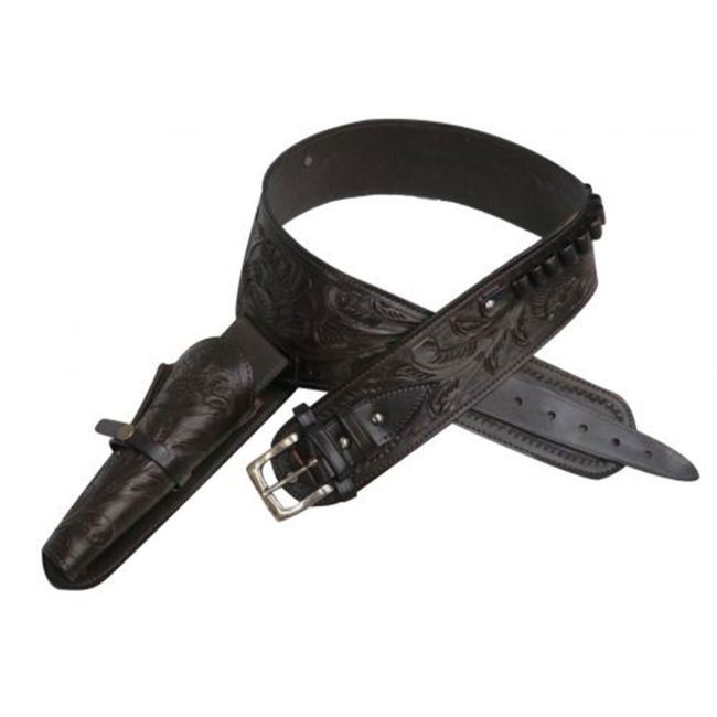 Showman ® 38/357 Caliber Dark oil tooled leather Western gun holster and belt. Equipped with leather tie strings to hold gun close to your thigh and reduce unwanted movement. Great for riding or concealed carry.